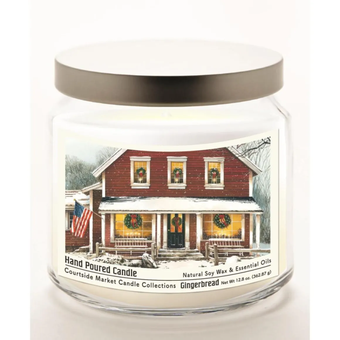 Courtside Market Christmas Farmhouse Soy Wax Candle Infused With Essential Oil In Glass Jar With Brushed Silver Lid
