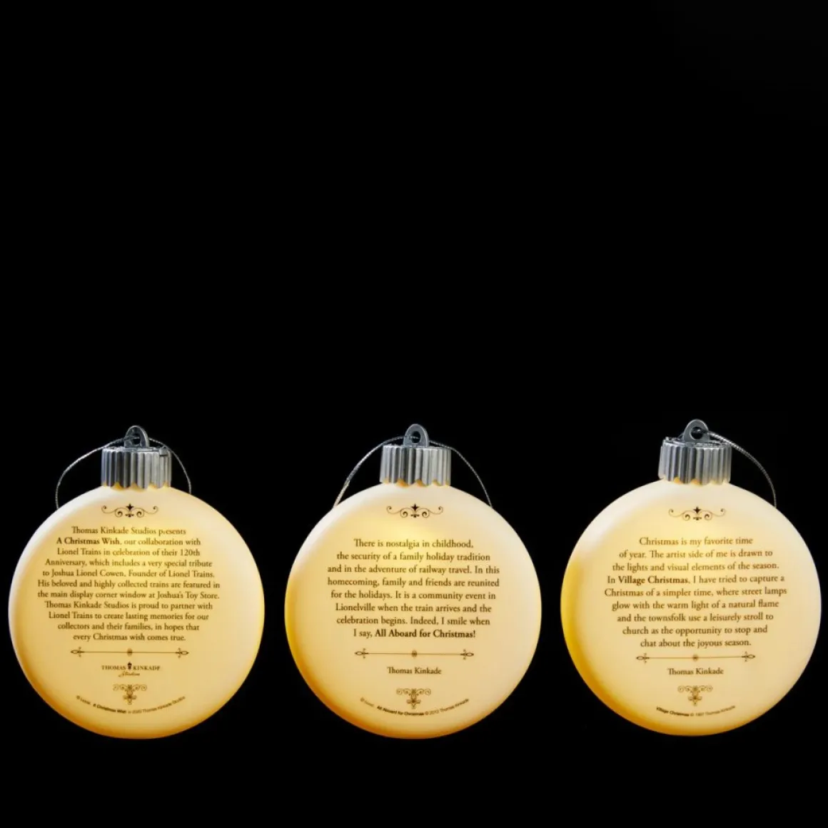 This Charming Assortment Of Thomas Kinkade Porcelain Led Ornaments Will Make A Wonderful Addition To Your Christmas Tree. On One Side Of The Colorful Circular, Flat-Shaped Ornaments Are Beautiful Illustrations By The Renowned Artist That Encourages You To Pause, Smile And Enjoy The Holiday Season. On The Reverse Side, Kinkade Describes In His Own Words The Inspiration Behind These Festive Pieces Of Art. They Come Ready With Individual Gift Bags For Easy Gifting.